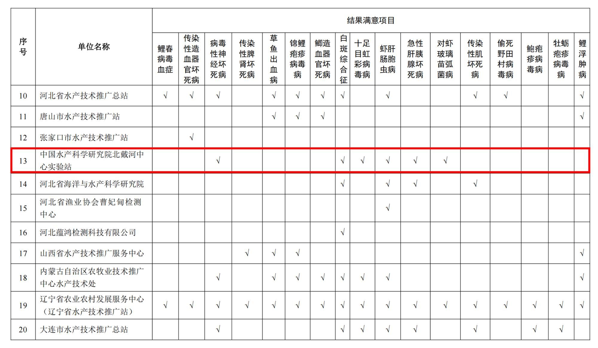 近日,全国水产技术推广总站发布了《全国水产技术推广总站关于公布2025年水生动物防疫系统实验室检测能力验证结果的通知》(农渔技函〔2025〕77号)。中国水产科学研究院北戴河中心实验站申报的病毒性神经坏死病、白斑综合征、十足目虹彩病毒病、虾肝肠胞虫病、急性肝胰腺坏死病、对虾玻璃苗弧菌病共计六种疫病病原的检测项目均通过能力验证,并获得2026年国家及省级水生动物疫病监测计划的相应疫病检测实验室备选资格。